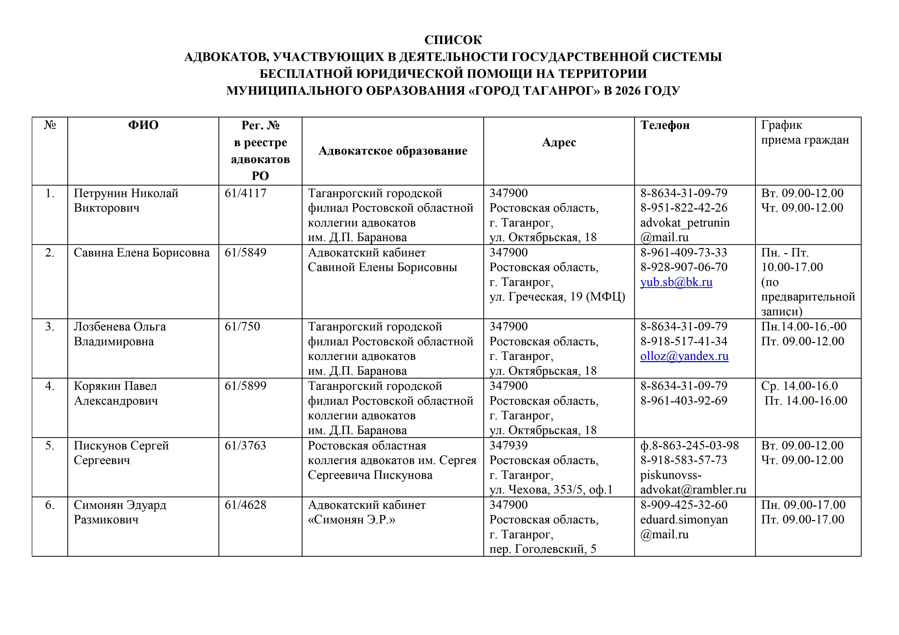Списка адвокатов которые будут оказывать бесплатную юридическую помощь в городе Таганроге в 2026 году.
