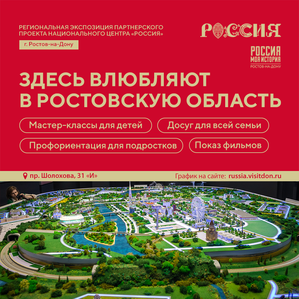 Президент России поддержал инициативу создания в каждом регионе экспозиций – наследников выставки «Россия». Проект объединяет культурное наследие страны и достижения регионов. В Ростовской области 25.01.2025 на базе парка «Россия – моя история» была запущена региональная экспозиция, полное название – региональная экспозиция партнёрского проекта национального центра «Россия». На экспозиции представлены 13 тематических площадок: от агропромышленности и цифровых технологий до туризма и волонтёрства.   Любой посетитель площадки может пообщаться с красным конём – наследием выставки «Россия» (ВДНХ, г. Москва), познакомиться с макетом, на котором представлены все 55 муниципальных образований региона и интерактивной картой Ростовской области, найти информацию о путешествиях по региону, размещенную на базе туристско-информационного центра.   Гостей экспозиции во время проведения активностей ждут интерактивы, викторины, встречи с экспертами и профориентационные мероприятия. Для детей — игры и мастер-классы, для взрослых — знакомство с регионом, просмотры тематических фильмов, возможность узнать о действующих предприятиях, организациях и проектах в различных сферах в Ростовской области!   В рамках знакомства с регионом запланированы как тематические дни (день Победы, день промышленности и культуры и т.д.), так и дни муниципальных образований Ростовской области, когда своими достижениями делятся муниципалитеты региона – от приглашения предприятий до знакомства с волонтёрскими проектами региона.   С 25.01.2025 по 19.07.2025 уже проведено 16 экспозиций с активностями. Их уже посетили более 22 тысяч человек из разных уголков нашего региона, страны, а также представители других государств (Абхазия, Армения, Белорусия, Иран и др.)!Для большинства посетителей (а почти 90% из них – молодежь) это профориентация и возможность узнать о регионе больше информации и влюбиться в него, а также остаться созидать здесь!